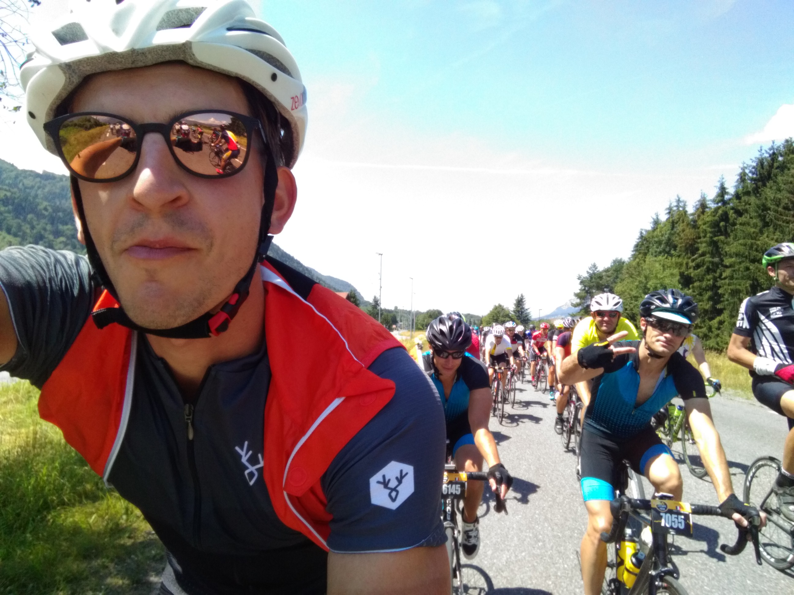 Parce qu’il fallait bien un peu de stress pour bousculer ma confiance acquise tout au long de mes entrainements, je m’étais fait piquer au genou par un frelon le mercredi soir avant la course, lors de ma dernière sortie vélo. Une réaction allergique a alors fait enfler ma jambe jusqu’à la cheville et me provoquait des fourmillements. J’ai bien cru devoir abandonné avant même de prendre le départ du fait que trois jours avant la jambe ne pliait pas en plein. Par chance et grâce aux compresses d’alcool, ma jambe a désenflé suffisamment pour me permettre de rouler le jour j. Malgré un reste d’inflammation et des fourmillements encore bien présents, nous nous sommes élancés avec Manu et Hervé du SAS 6 à 7 h 30 pour ce qui allait être une belle et longue journée ! La course commençait par le tour du lac d’Annecy. La vue était superbe et c’était vraiment agréable de rouler sur des routes fermées à la circulation automobile. Nous avons très rapidement trouvé un groupe qui roulait à notre rythme et ne l’avons plus quitté jusqu’à la première bosse au niveau de Talloire. Cela nous a permis de nous économiser et d’arriver frais au pied du col de la croix fry.